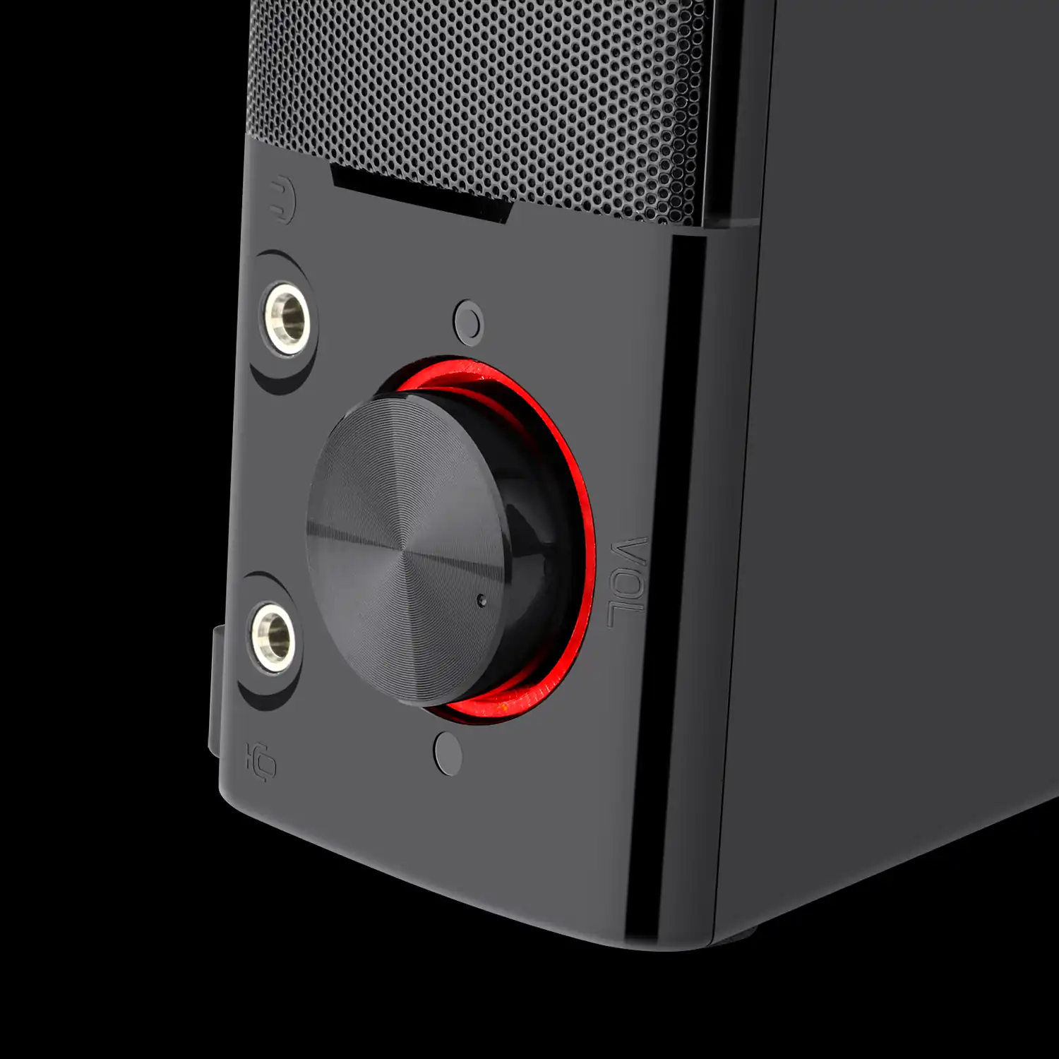 Com iluminação LED vermelha, ela adiciona aquele toque gamer clássico ao ambiente. O controle de volume frontal com disco rotativo facilita ajustes rápidos, enquanto as conexões frontais para fone e microfone tornam o uso com headset muito mais prático.