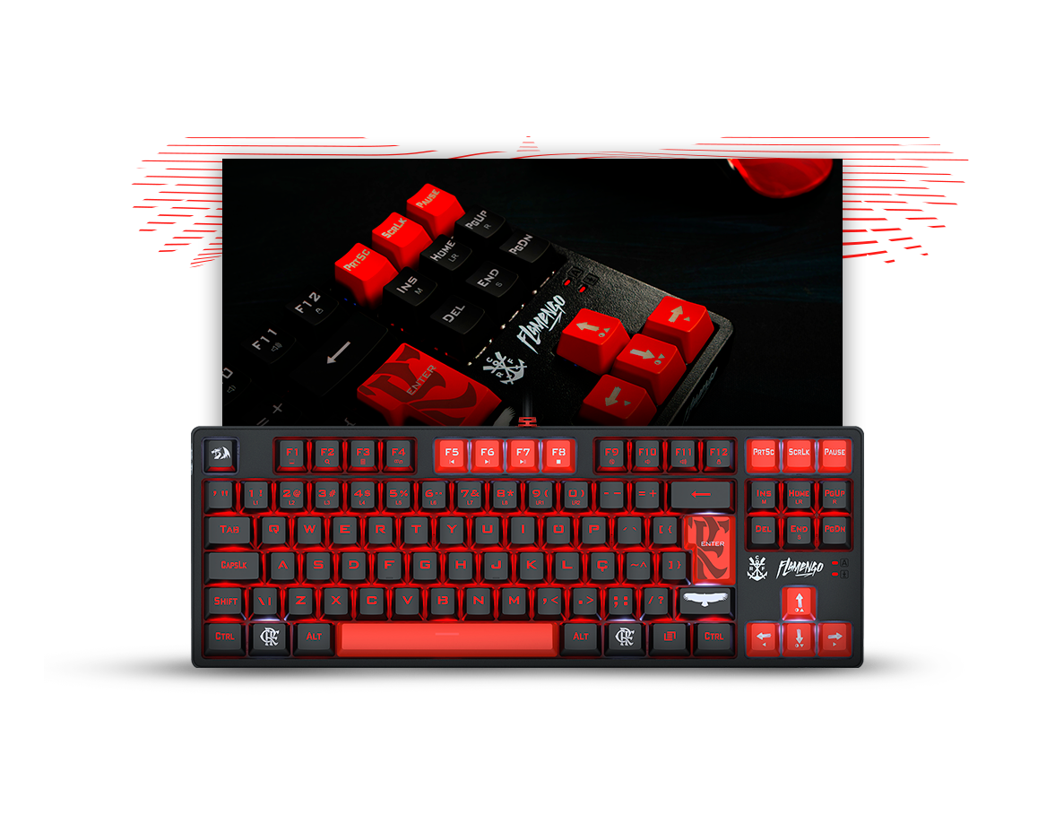 O Teclado Flamengo Nation FL576 vem equipado com switches mecanicos marrons, layout ABNT2, keycaps personalizadas nas cores do Mengao e iluminacao vermelho e branco. Ideal para quem busca conforto, qualidade e aquele visual marcante no setup.