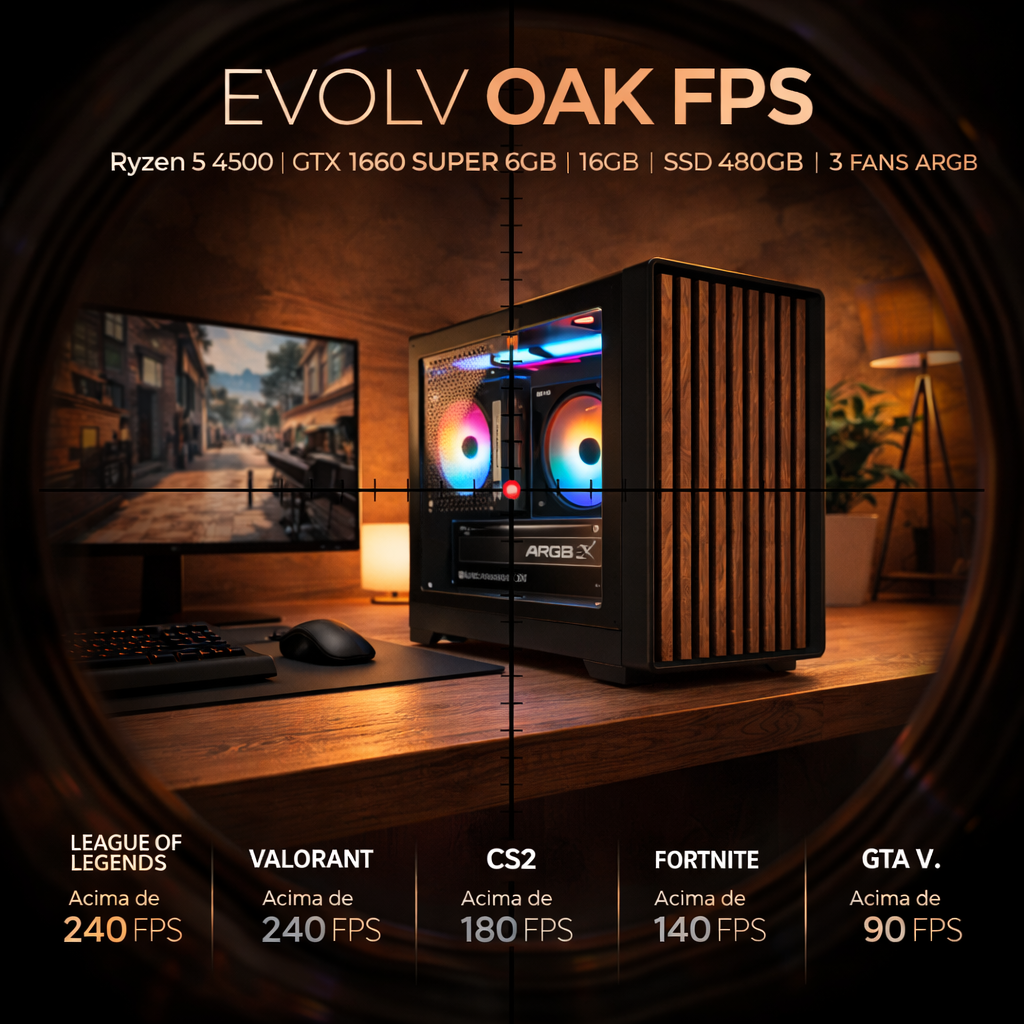 A linha LevelUP Evolv foi criada para oferecer computadores equilibrados para diferentes estilos de jogador. O Evolv OAK FPS se posiciona como a opção intermediária da linha, entregando excelente desempenho para jogos competitivos e um visual único graças ao gabinete com acabamento em madeira.