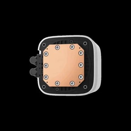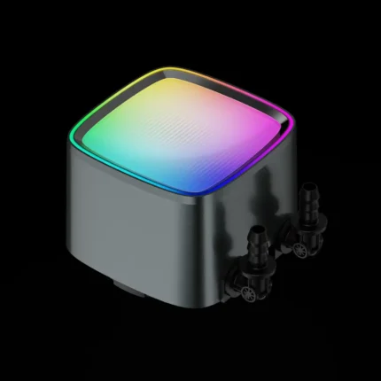 O bloco do water cooler já vem com uma bomba silenciosa, projetada para manter bom fluxo de fluído sem gerar ruído, enquanto a base de cobre garante transferência térmica eficiente. Já os amortecedores de borracha nos cantos das fans ajudam a absorver vibrações e ruídos indesejados, mantendo o ambiente mais silencioso mesmo com o sistema operando em carga máxima.